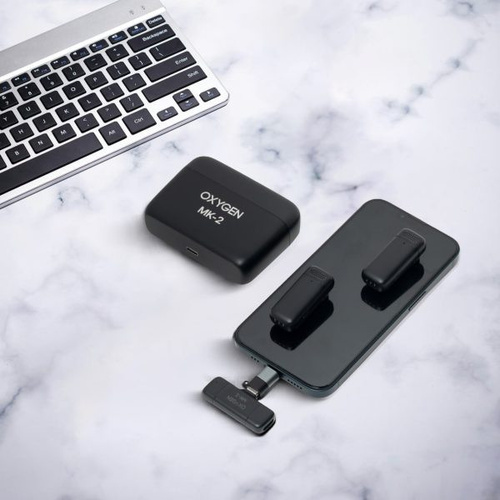 میکروفون دو کاربره اکسیژن مدل OXYGEN MK-2 دارای دو میکروفون بی سیم و یک گیرنده که به گوشی موبایل یا تبلت از طریق پورت TYPE-C یا با تبدیلی که همراه میکروفون دو کاربره اکسیژن مدل OXYGEN MK-2 هست به گوشی آیفون هم متصل می شود. با میکروفون دو کاربره اکسیژن مدل OXYGEN MK-2 دو شخص به صورت همزمان می توانند بدون تاخیر و با کیفیت عالی صحبت کنند، قابلیت دیگر همزمان با رکورد کردن می توان، گوشی خود را شارژ کرد. هر سه قطعه گیرنده و فرستنده ها با کابل TYPE-C شارژ می شوند. نهایت فاصله بین میکروفون با گیرنده متصل به گوشی حدود 20 متر می باشد که این قابلیت خوب بخاطر فرستنده 360 درجه امواج رادیویی می باشد. تفاوت MK-2 با MK-1 ظاهر شکیل تر و باکس شارژ است که هر موقع شارژ میکروفون ها تمام شد، با گذاشتن داخل باکس شارژ می شود و نیاز به آوردن شارژر نیست که این قابلیت مهم است.